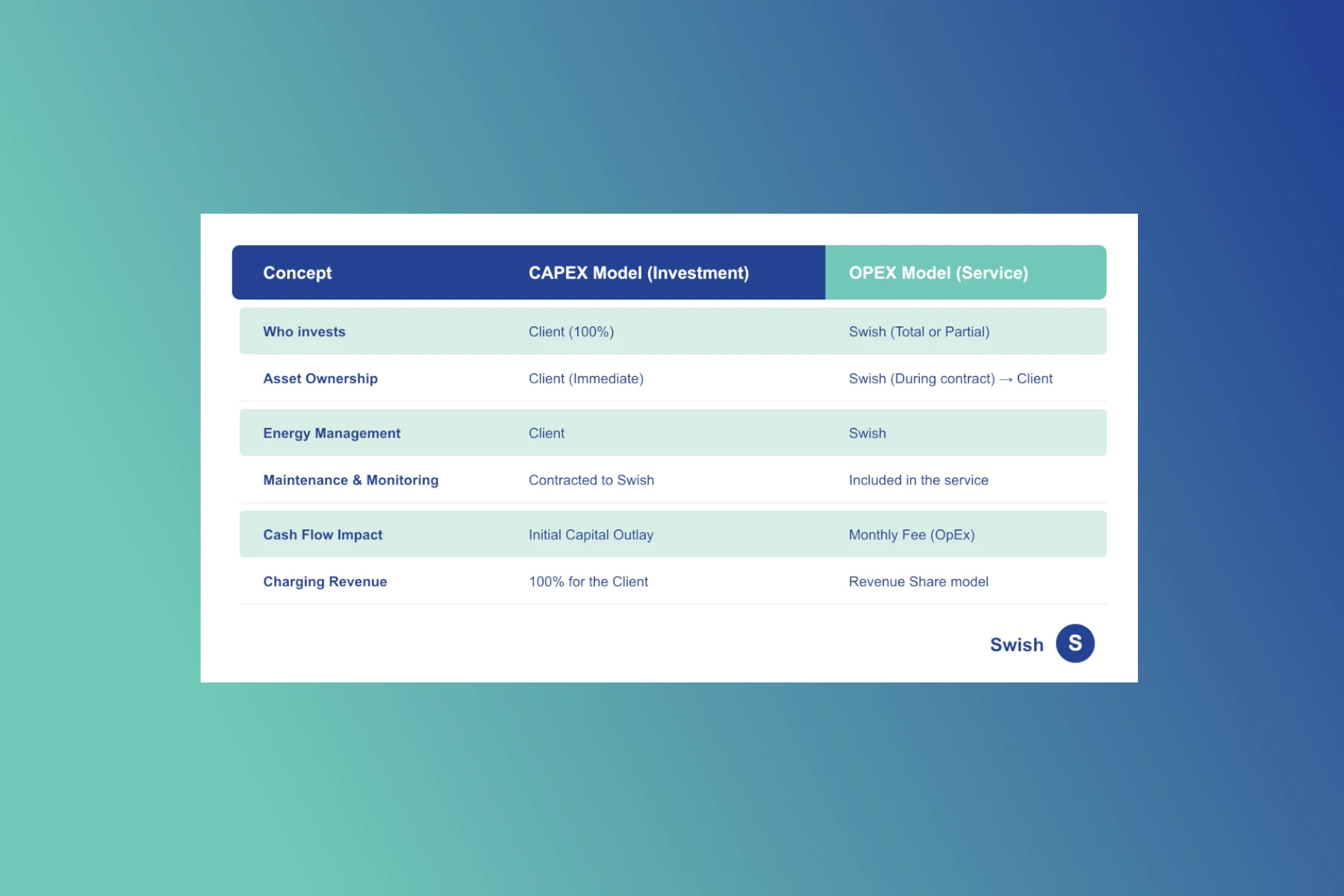 At Swish, we don't just act as a supplier, but as an investing partner. We cover 100% of the project costs—from the site survey and civil works to high-power equipment. We transform an uncertain CAPEX into a predictable, tax-deductible OPEX.