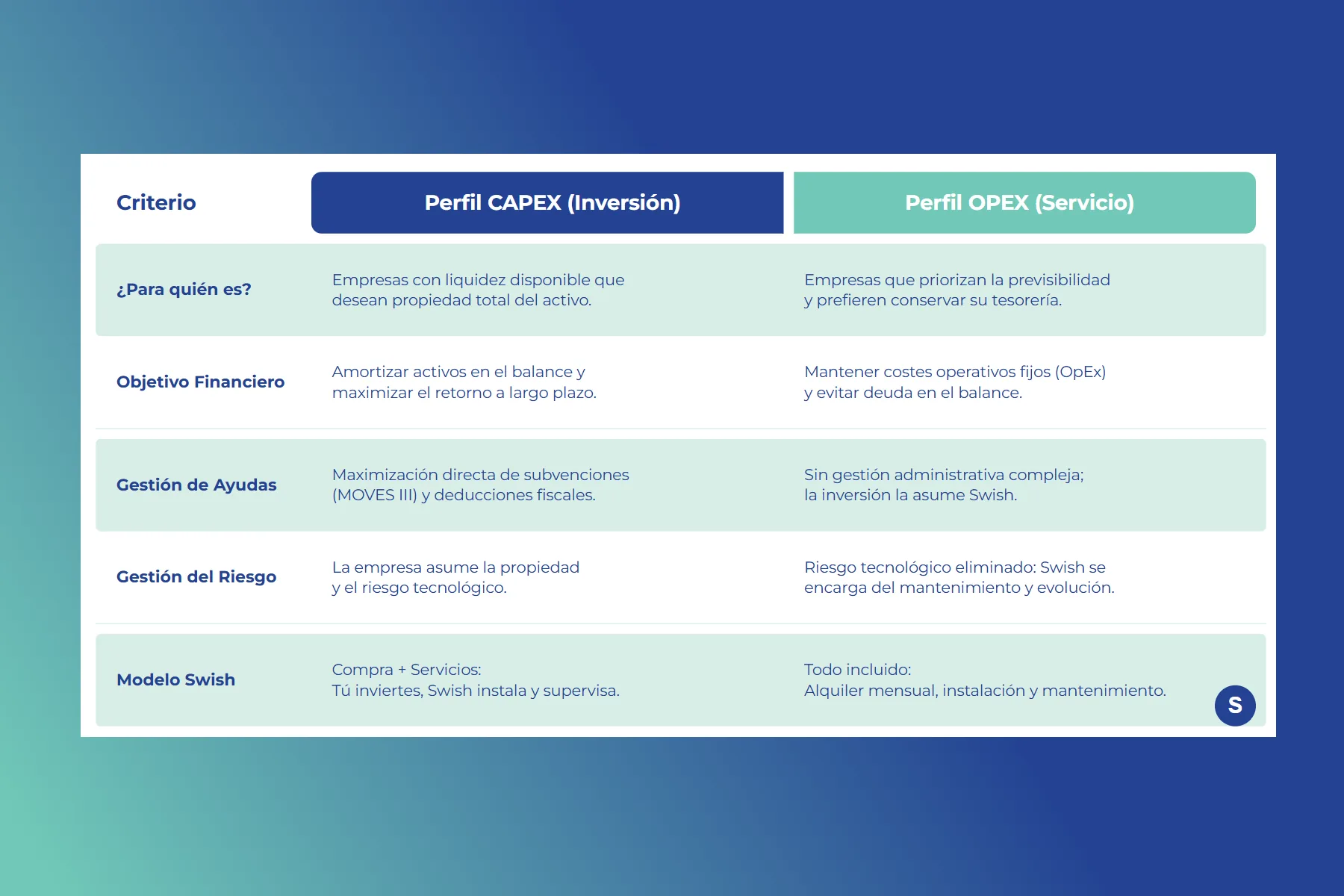 En el escenario actual, no existe una única forma correcta de abordar la inversión. En Swish, nos adaptamos a tu estrategia de tesorería. Lo que no cambia es la simplicidad. Ya elijas comprar el activo (CapEx) o contratar el servicio (OpEx), Swish actúa como tu único interlocutor estratégico.