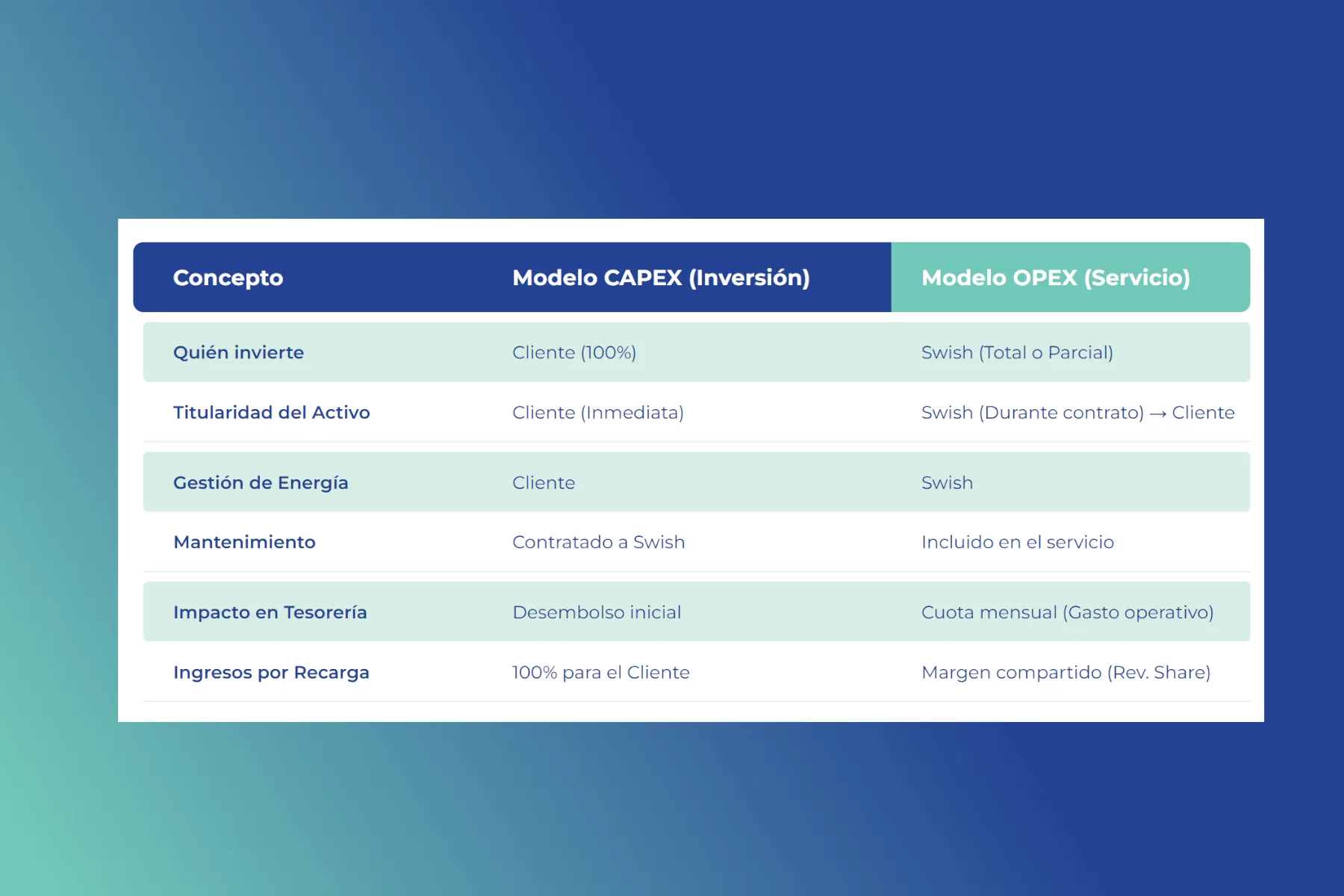 En Swish no actuamos como un proveedor, sino como un socio inversor. Nosotros asumimos el 100% del coste del proyecto —desde la auditoría y la obra civil hasta los equipos de alta potencia— Transformamos un CAPEX incierto en un OPEX predecible y deducible.