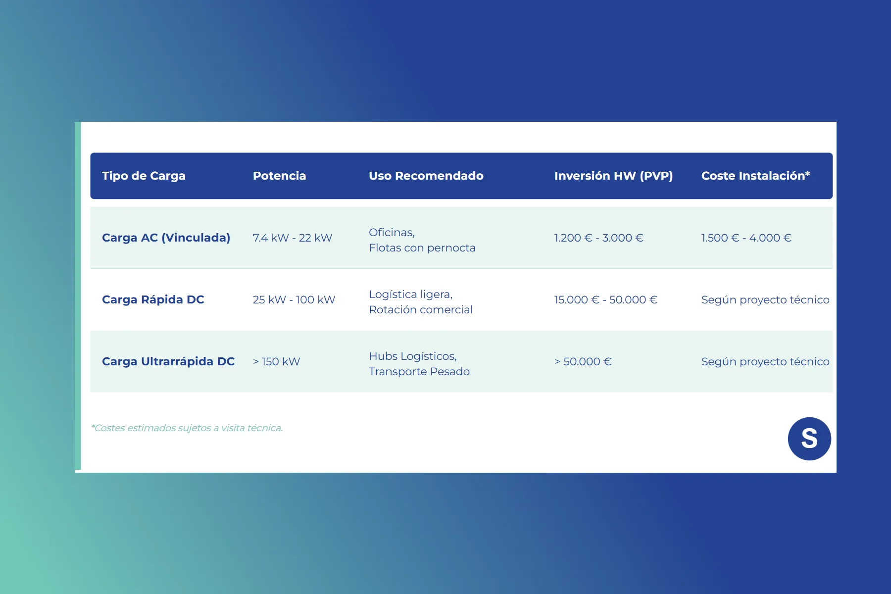- Solución Estándar: Cargadores AC de 7.4 a 11 kW. Inversión Media: 2.000 € - 5.000 € por punto (llave en mano).