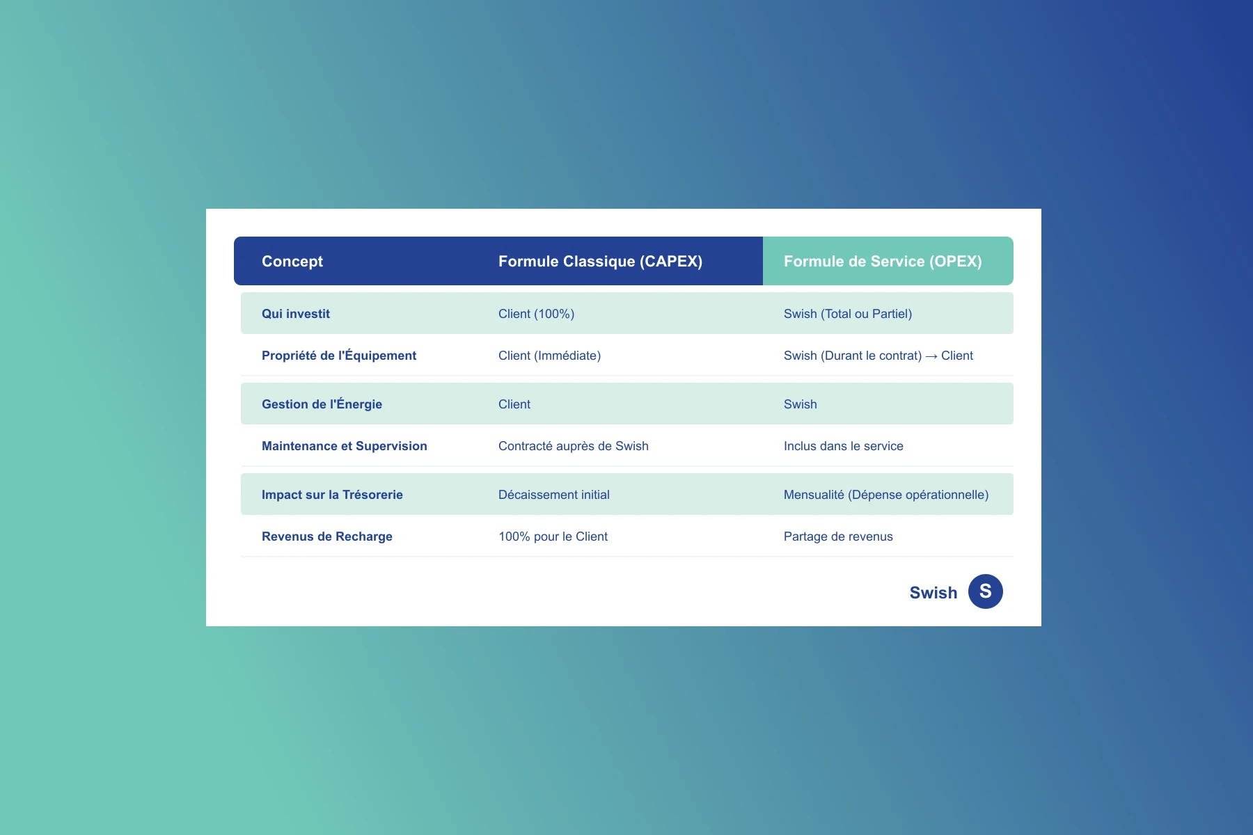Chez Swish, nous n'agissons pas comme un simple fournisseur, mais comme un partenaire investisseur. Nous assumons 100% du coût du projet — de l'audit et du génie civil jusqu'aux équipements haute puissance. Nous transformons un CapEx incertain en un OpEx prévisible et déductible.