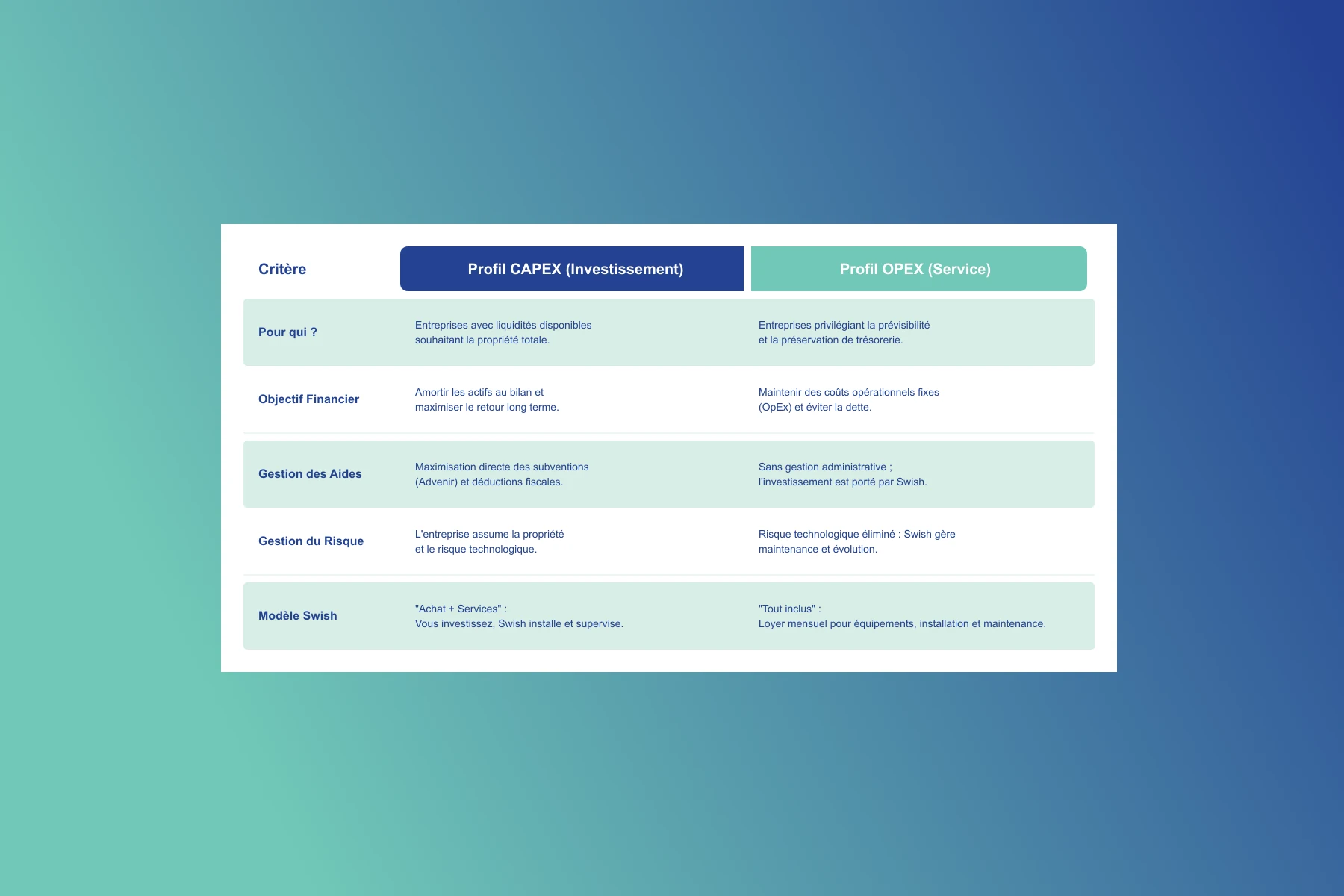 Chez Swish, nous nous adaptons à votre stratégie de trésorerie. Ce qui ne change pas, c'est la simplicité. Que vous choisissiez d'acheter l'actif (CapEx) ou de souscrire au service (OpEx), Swish reste votre interlocuteur stratégique unique.