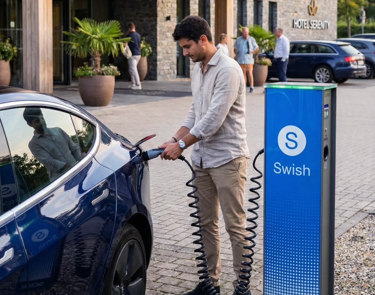 Vos clients localisent, réservent et paient la recharge depuis leur mobile avec Swish Charge, sans besoin d'abonnements ni d'inscriptions complexes (Paiement direct).
