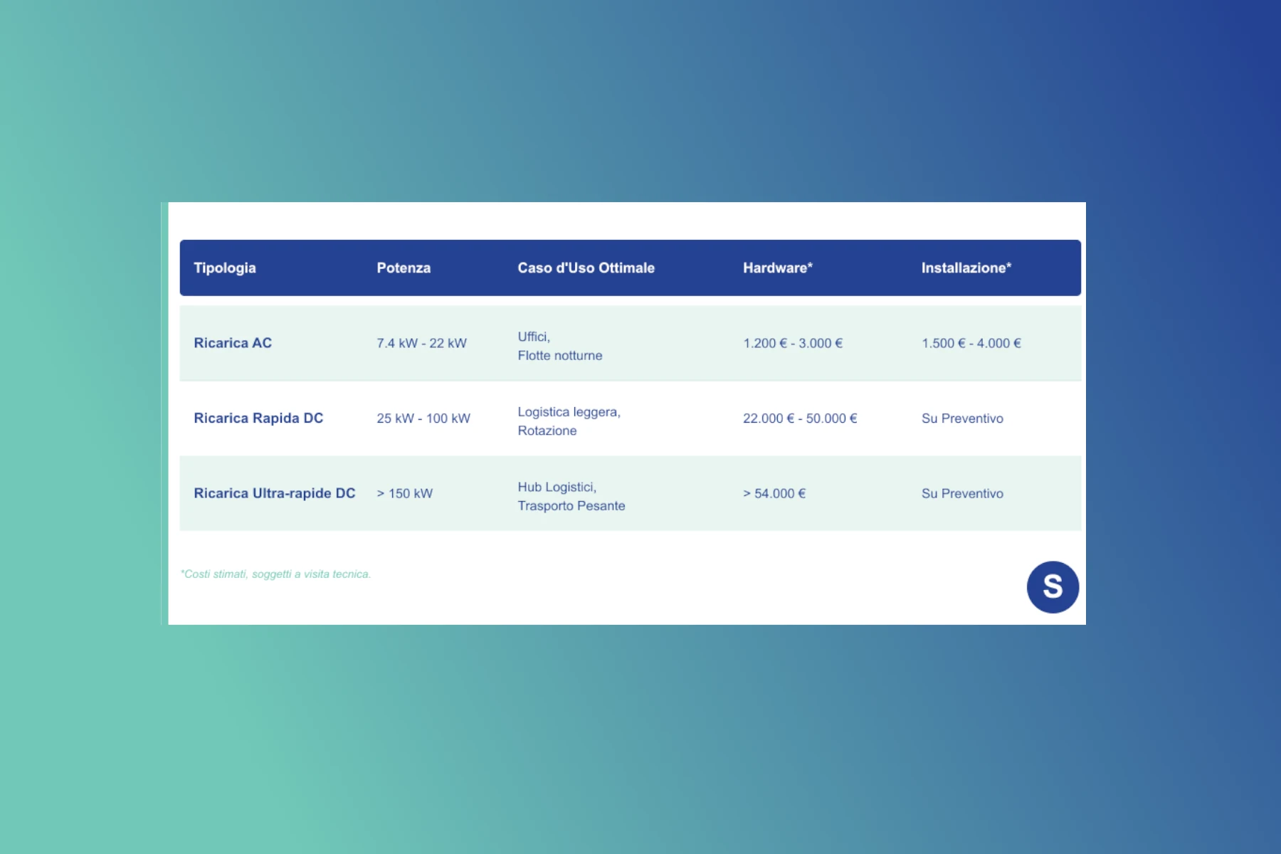 - Driver di Costo: Il volume degli stalli. Il costo unitario diminuisce elettrificando più posti simultaneamente grazie alla gestione dinamica del carico, evitando di dover richiedere aumenti di potenza al distributore.